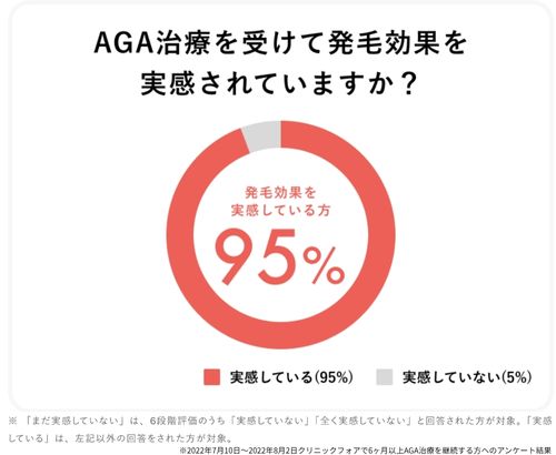 クリニックフォアで6ヶ月以上AGA治療を継続されている648名にアンケートした結果、95%の人が発毛効果を実感していると回答。